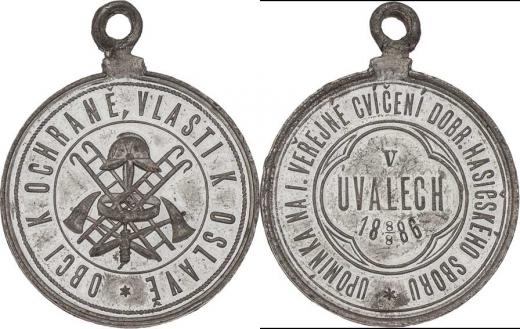 Úvaly 1886 - I.veřejné cvičení hasičského sboru 8.8., Nesign., cín 25 mm s původním raženým ouškem, patina