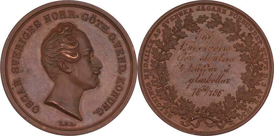 Švédsko (uděleno 1896) - Oscar I. zprava, opis / udělení v dubovém věnci a opis, Sign.LPL, bronz 34mm, 17.836g, krásná patina