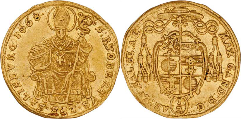 1/2 Dukát 1668, Sv.Rupert, opis / znak, opis, Zot.1960, Pr.1634, 1.709g, nep.hr., nep.rysky, nep.zvlněný, pěkná patina R!