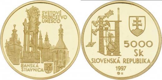5000 Koruna 1997 - Banská Štiavnica, světové dědictví UNESCO, KM.36 (Au900, 9.50g, pouze 8000 ks), kapsle, etue, karta, přebal