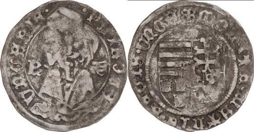 Groš b.l. (1468-1470), zn."K-štít", jako Husz.692, ale kratší opis "...REGIS.VNGA.", 2.992g, nedor., patina RR!
