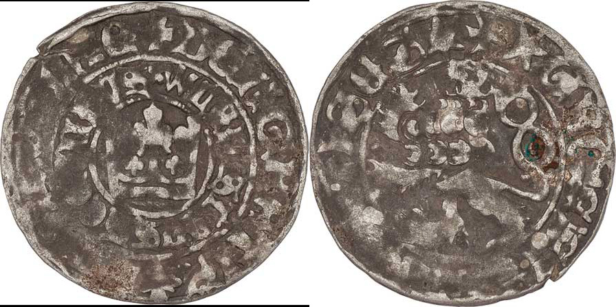 Pražský groš, K.Hora - Hanuš z Řásné, Há.XIII.e/2, dobře patrné 4 měsíčky ve hřívě lva, 2.623g, nedor., patina