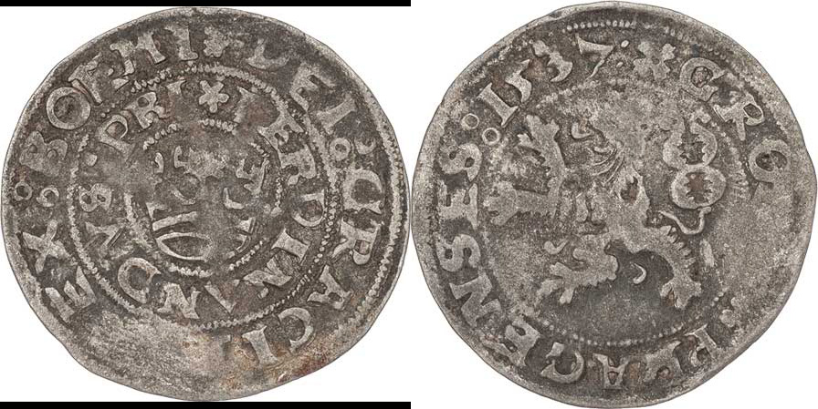 Pražský groš 1537, K.Hora-Jeptiška, Chv.C1/e.K, královská koruna, J.4, MKČ.70, 2.741g, nedor., patina