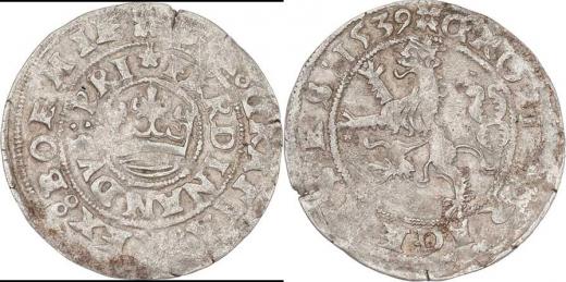 Pražský groš 1539, K.Hora-Jeptiška, Chv.T7/a.K - varianta - "GROSI" s jedním "S", královská koruna, J.4, MKČ.70, 2.818g, nedor., nep.dvojráz, patina RR!
