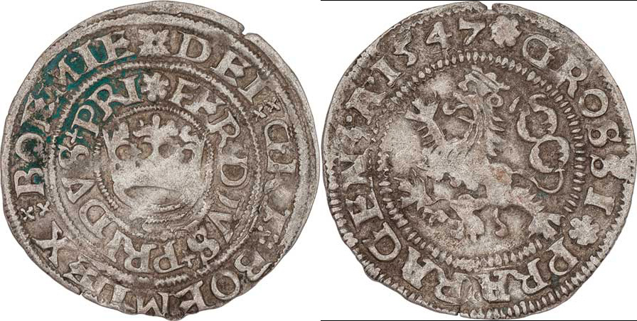 Pražský groš 1547, Kutná Hora-Lídl, Chv.(6)/a.K - vnitřní opis "* FERDINANDVS + PRI", J.4, MKČ.71, 2.618g, nep.exc., nep.vada raz., nep.nedor., pat. RR!