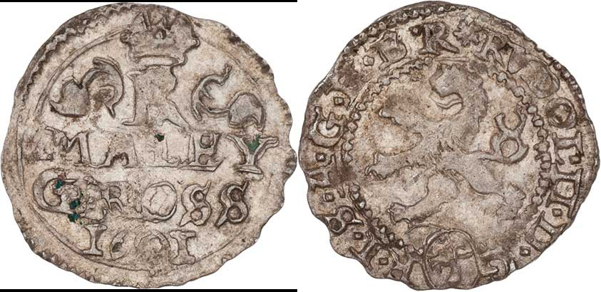 Malý groš 1601, K.Hora-Špís, HN.12b (opis 7a), nápis " MALEY / GROSS / 1601 ", 0.777g, nepravidelný tvar střížku, nep.nedor., skvrnky, pat.