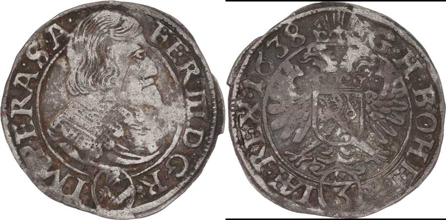 3 Krejcar 1638, K.Hora-Geronis, J.4a, MKČ.1195, 1.282g, nedor., patina