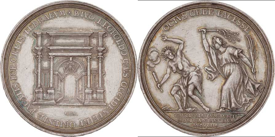Brunner a Nürnberger - na mír v Karlovaci 1699 - Pax zahání Litici, písmo / vítězný oblouk, opis, nápis na hraně, Sign., 43mm, 34.178g, M.1157, H.2196, hlazená