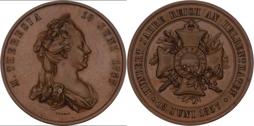 Seidan - AE med. na 100 let řádu Marie Terezie 1857 - poprsí zprava, opis / klenot řádu s mečem a vavříny, opis, Sign., 58mm, ČS.1349, nep.rysky, pěkná patina