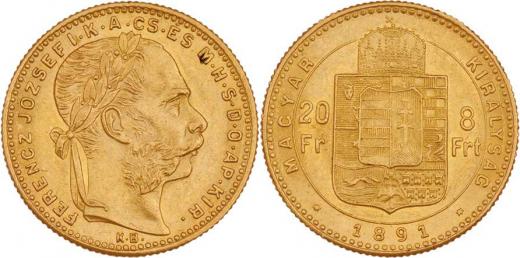 8 Zlatník 1891 KB - se znakem Rijeky, 6.447g, nep.hr., nep.rysky, pěkná patina, téměř