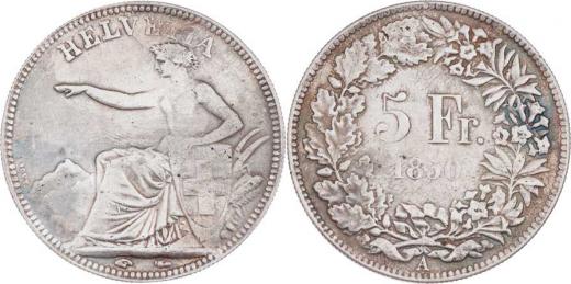 5 Frank 1850 A - sedící Helvetia, KM.11 (Ag900), 24.700g, nedor., dr.rysky, skvrnky, patina R!