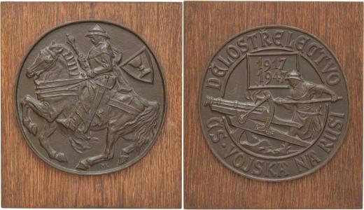 Dělostřelectvo čs.vojska na Rusi - bronzové jednostr. odlitky původního sádrového modelu medaile, Sign.MK (Karel Minář), 175/180 mm, dřevěné podložky RRR!