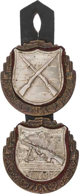 Kožený závěsník se dvěma střelec. odznaky - Střelec z pušky a Střelec z lehkého kulometu, oba II.třída, oba Sign."MSS", Bartko.2,4, Krubl.tab.16/2,5