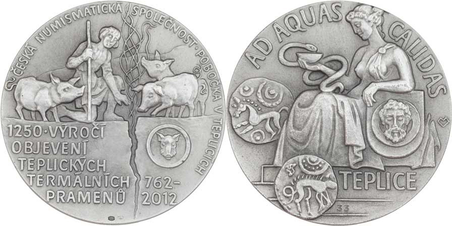 Vitanovský - 1250 let objev.pramenů 2012 - pastýř s prasaty, písmo / Salus, keltské mince, znak, písmo, Sign., patin. Ag925, 40mm, 30.665g, 100ks, etue RR!