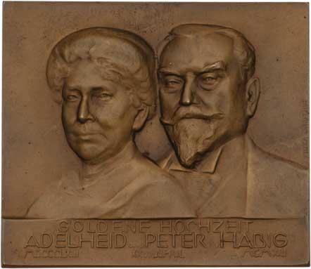 Adelheid a Peter Habig - zlatá svatba 26.IV.1913 - dvojportrét, 3-řádkový nápis, Sign., jednostranná bronzová plaketa 75x65 mm, Haus.7414, patina