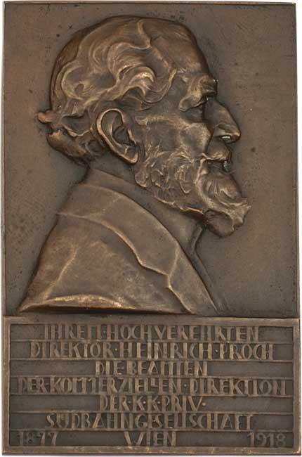 Heinrich Proch, ředitel Společnosti Jižní dráhy 1918 - poprsí zprava, 7-řádkový nápis, Sign., jednostranná bronzová plaketa 50x78 mm, pěkná patina