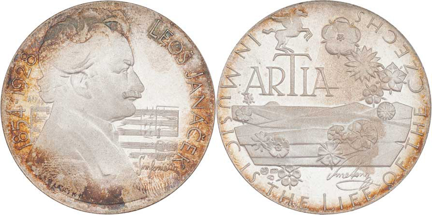 Leoš Janáček - Artia - V hudbě život Čechů (1977) - poprsí zprava, noty, opis / emblém, krajina, květiny, opis, Sign., Punc., Ag900, 38mm, 25.439g, patina