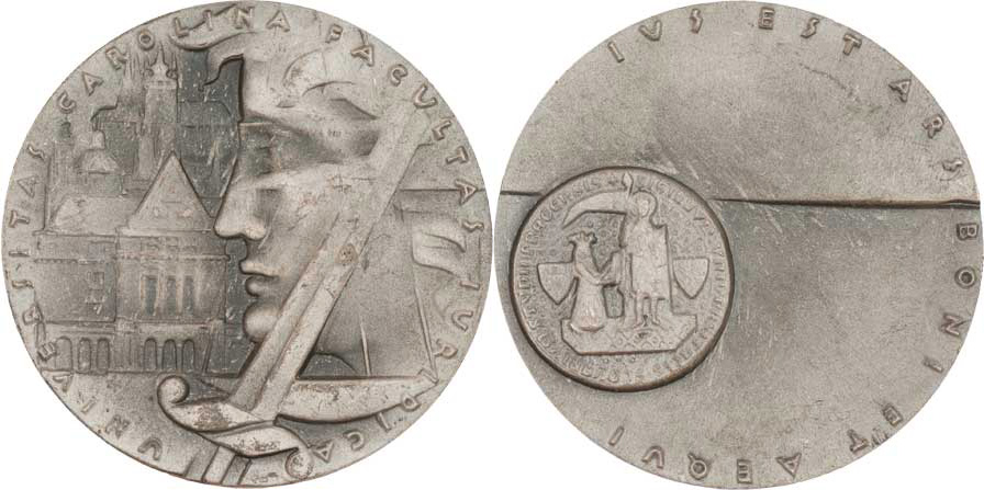 Právnická fakulta Karlovy university b.l. (1978) - profil Iusticie zleva, budovy, opis / univers. pečeť, latin.opis, Sign., patin. Ag900, 80mm, 173.878g, k.15