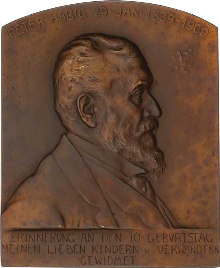 Peter Habig - majitel továrny na klobouky ve Vídni 1839/1909 - poprsí zprava, nápisy, Sign., patinovaný jednostranný bronz 60x74 mm, Haus.7413, patina, téměř