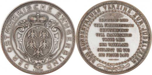 Rakouský zpěvácký spolek b.l. - dolnorakouský znak v kartuši, opis / zářící hvězda, 8-řádkový nápis a opis, Sign., postříbřený bronz 46mm, 42.599g, pat.