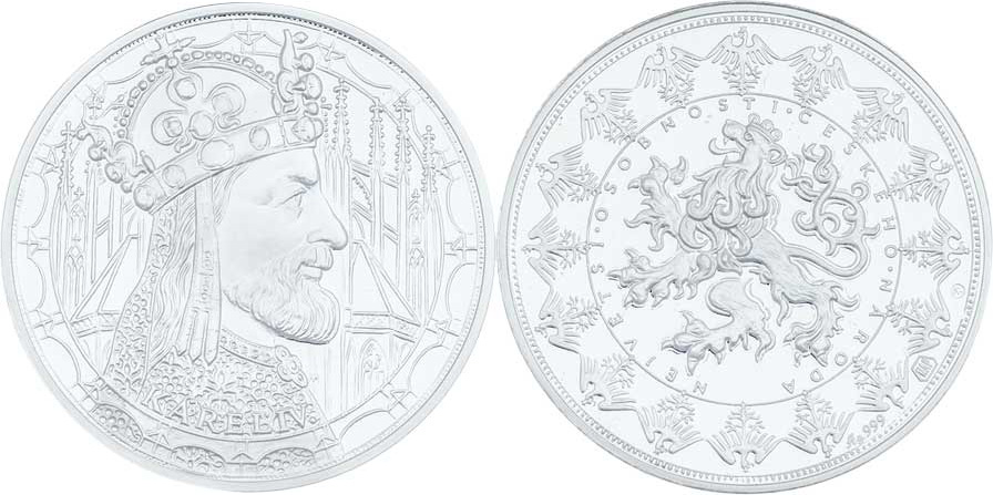 Největší osobnosti českého národa b.l. - Karel IV. - poprsí zprava, most / český lev, opis, kruh orlic, Sign., Ag999, 34mm, 15.949g, kapsle