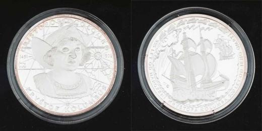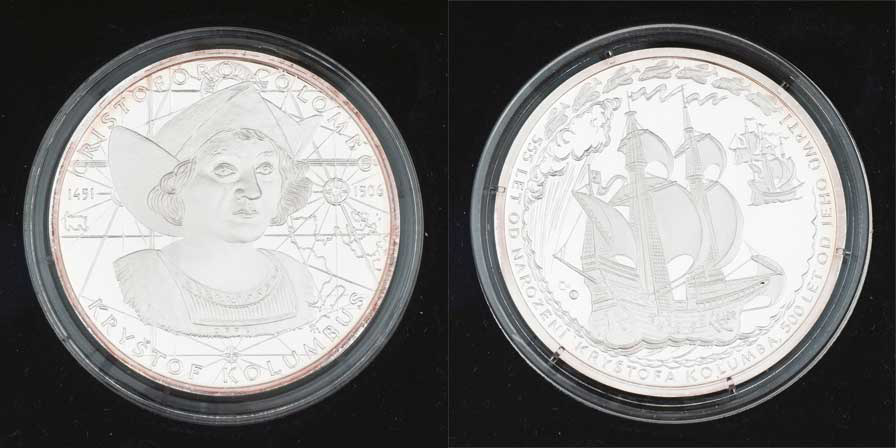 Kryštof Kolumbus - 555.výročí narození a 500.výročí úmrtí - poprsí nad mapou, písmo / lodě, ryby, opis, Sign., Ag999, 50mm, 42.0g, kapsle, etue, text, patina