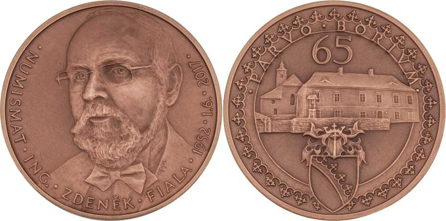 Zdeně Fiala, numismatik - na 65.narozeniny 1952/2017 - portrét mírně zleva, opis / Malý Bor u Horažďovic, znak Velharticů, opis, Sign., pat.měď 40mm, 40ks RR!