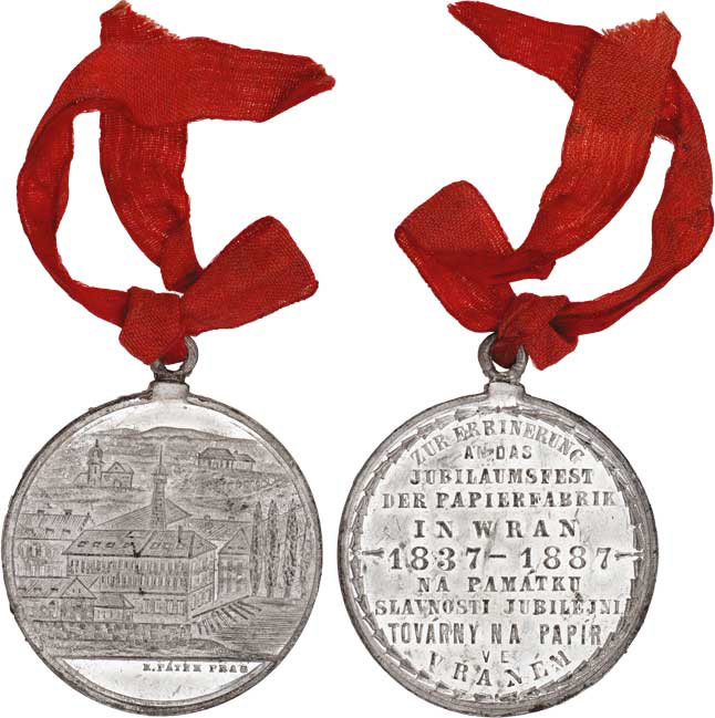 Vrané na Vltavou - 50 let papírny 1837/1887 - pohled na továrnu v krajině/ 11-řádkový německo-český nápis, Sign., cín 33 mm s původ. raženým ouškem a stužkou R!