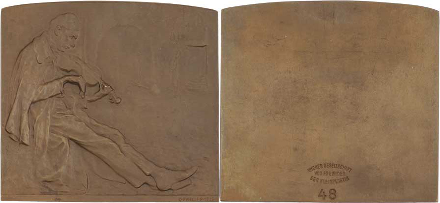 Houslista 1909, Sign., plaketa vydaná Vídeňskou spol. přátel drobné plastiky, číslo 48, patinovaný jednostranný bronz 75x70 mm