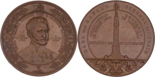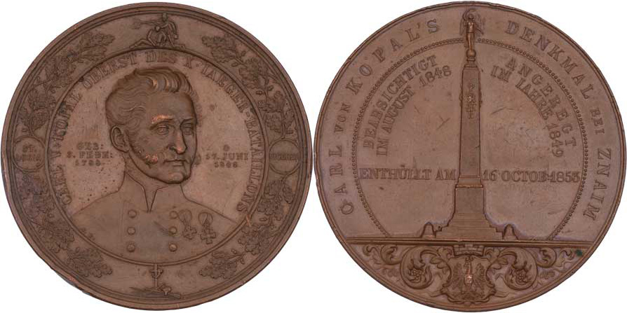 Znojmo - odhalení pomníku generála Kopala 16.X.1853 - poprsí zpředu, dubový věnec, písmo / pomník, znak, písmo, Sign., měď 64 mm, hrany, dr.škr., rys., patina