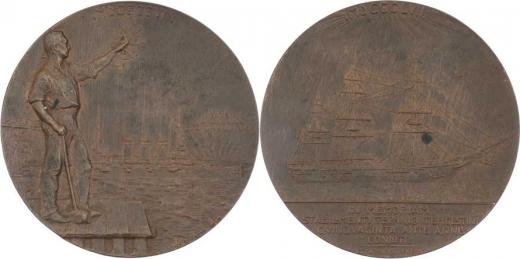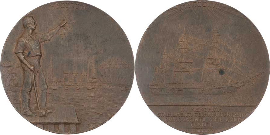 50.výročí založení tech. vysoké školy v Terstu 1907 - přístavní dělník, v pozadí křižník Av.Ferdinand Max. / trojstěžník, nápis, Sign., bronz 60 mm, skvrnka R!