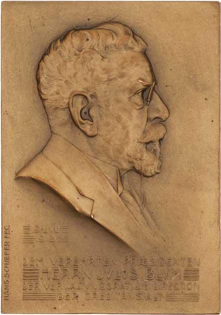 Julius Blum - president banky Creditanstalt 19.7.1913 - poprsí zprava, 6-řádkový nápis, Sign., patinovaný jednostranný bronz 48x70 mm, Haus.7228, pěkná patina