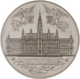 Vídeň - niklová medaile na dostavbu radnice 1883 - Vindobona na trůnu a architekt s plány / průčelí, andělé a nápis, Sign., 72mm, 163.185g, původní etue
