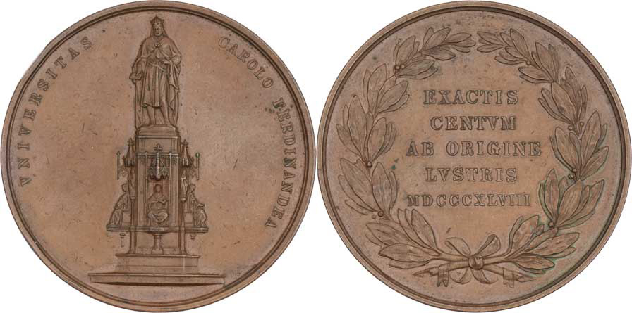 Karlova Universita - 500.výročí založení 1848 - pomník Karla IV., latin. opis / latin. 5-řádk. nápis ve věnci, Sign., bronz 52 mm, MZČ.150/7, hr., rysky