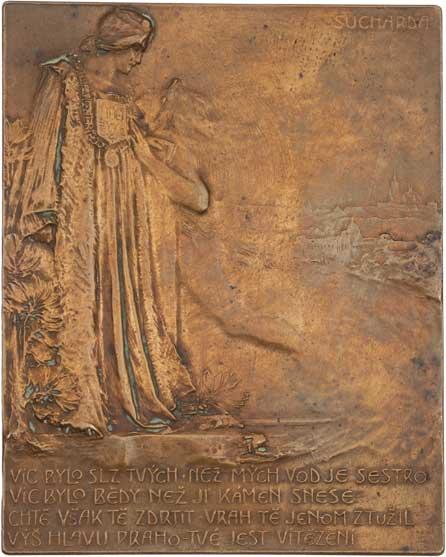 Vltava a Praha - AE jednostranná plaketa b.l. (1902) - dvě alegorické postavy, v pozadí pohled na město, 4-řádkový nápis, Sign., patinovaný bronz 58x72 mm