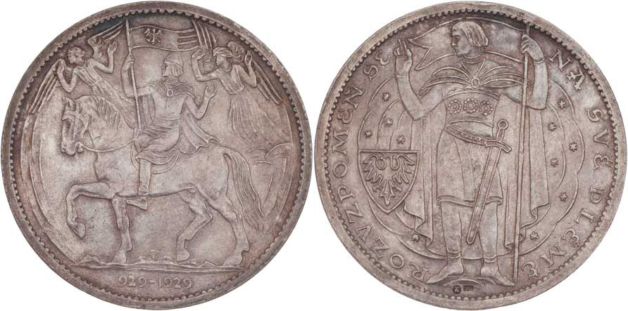 Větší medaile na milénium sv. Václava 1929 - svatý Václav na koni, andělé, vročení / svatý Václav, znak, opis, Punc., Ag987, 40mm, 30.039g, nep.hr.,pěkná pat.
