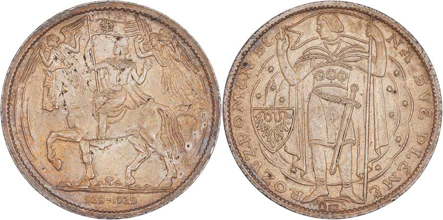 Menší medaile na milénium sv. Václava 1929 - svatý Václav na koni, andělé, vročení / svatý Václav, znak, opis, Punc., Ag987, 28mm, 14.953g, nep.hr.,pěkná pat.