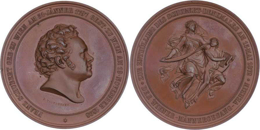 Vídeň - odhalení pomníku Fr.Schuberta 15.V.1872 - hlava zprava, opis / múza učící mladíka hře na lyru, opis, Sign., bronz 63 mm, dr.hr., krásná patina