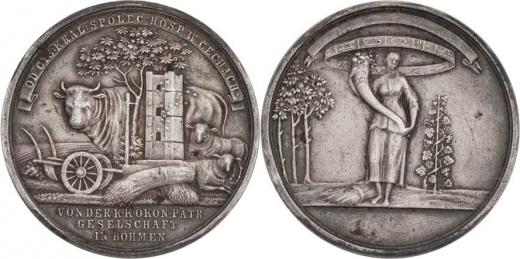 Hospodářská spol. pro Moravu a Slezsko b.l. - stojící Ceres, réva, zvěrokruh/ symboly hospodářství, nápis, Sign., Ag 43mm, 42.264g, dr.hr., rysky, patina