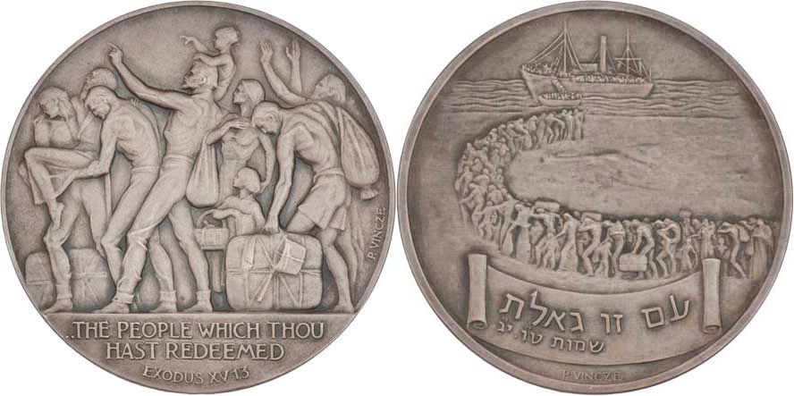 P.Vincze - Exodus XV./13 b.l. - lidé se zavazadly, angl.nápis / obrovský zástup mířící k lodi, hebrejský nápis, Sign., Punc., patinované Ag999, 57mm, 99.505g