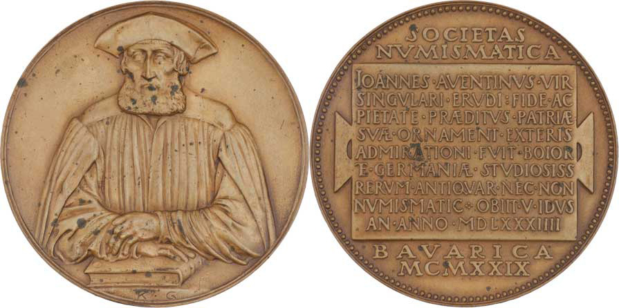 K.Götz - Bavorská numismatická spol. - Joh. Aventinus 1929 - polopostava zpředu s knihou/ 14-řádk. latinský nápis, Sign., patin.bronz 60 mm, skvr., lakov., téměř