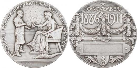 25 let Skandinávské obchodní komory a burzy 1886/1911 - personif. obchodu, mapa, opis / vročení, girlandy, tabulka pro udělení, patin. Sign., Ag 56mm, 95.561g