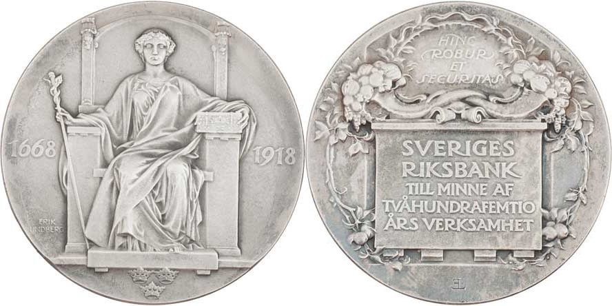 250.výročí založ. Švédské říšské banky 1918 - sedící personifikace Švédska, vročení / dva rohy hojnosti, nápisy, Sign.E.Lindberg, patinov. Ag 60mm, 101.592g