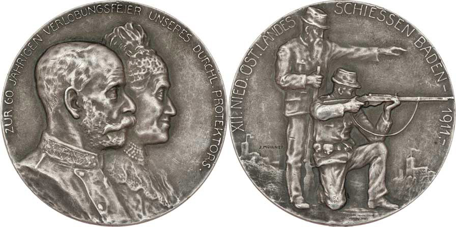 Baden 1911 - XII. dolnorakouské spolkové střelby, protektorský pár zprava, opis / dva střelci, opis, Sign.Müllner, Punc., patinov. Ag 42mm, 33.731g, rysky