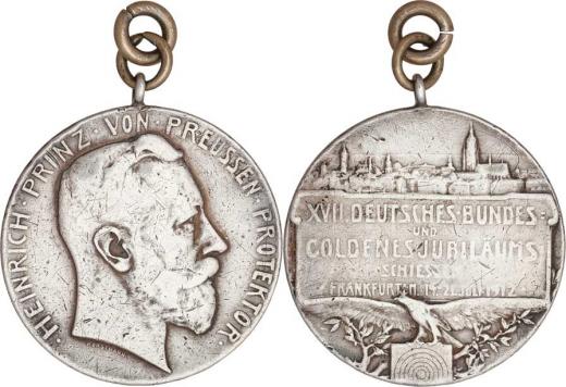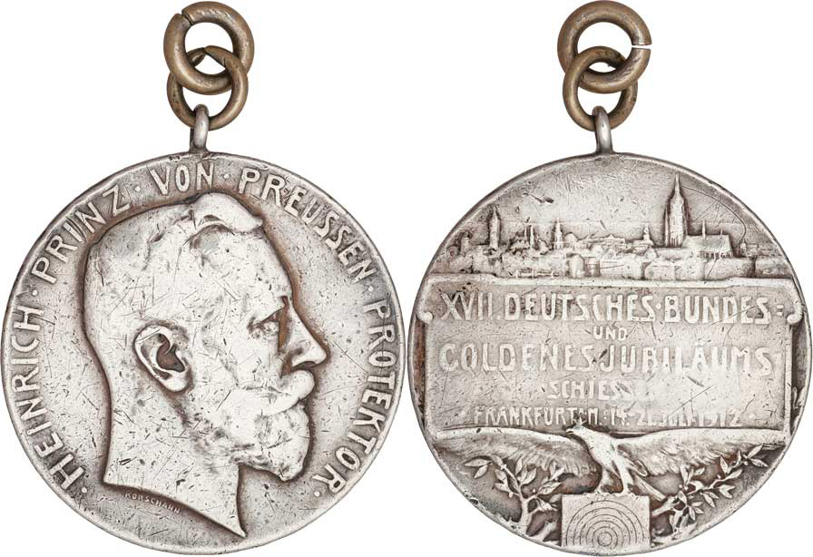 Frankfurt nad Mohanem 1912 - pruský princ Heinrich zprava, opis / pohled na město, nápis, orlice a terč, Ag 40 mm s původním ouškem a závěsným kruhem, 26.699g