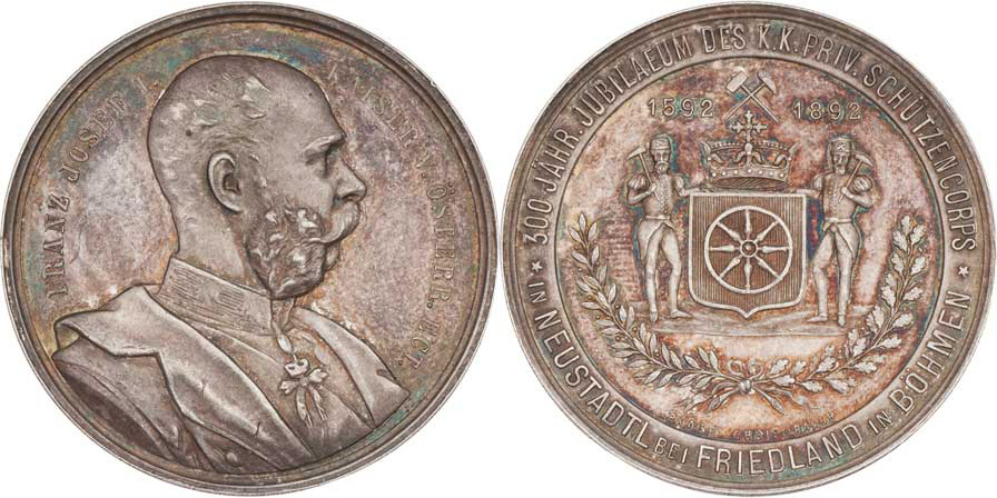 Nové Město pod Smrkem 1892 - 300 let spolku, poprsí císaře zprava, německý opis/ znak se štítonoši, opis, Sign.Christlbauer, Ag 37mm, 16.986g, patina R!