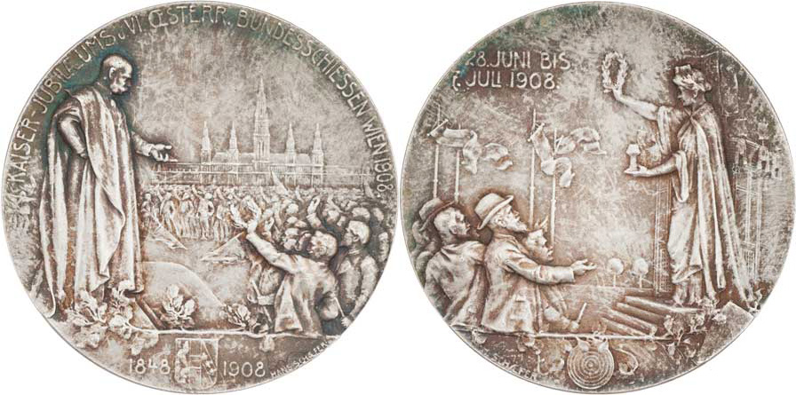 Vídeň 1908 - císařské jubilejní střelby - davy zdraví císaře, opis/ Vindobona předává věnec a pohár, nápis, Sign.Schaefer, Punc., Ag 38mm, 26.979g, patina