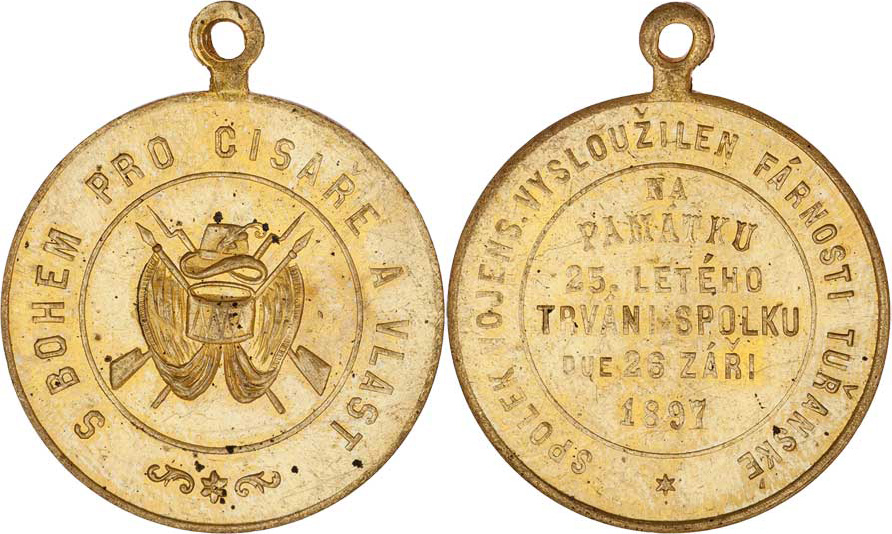 Tuřany 1897 - 25 let trvání spolku 26.9., Nesign., zlacená mosaz 31 mm s původním raženým ouškem, Indra.str.50, nep.nedor., nep.rysky