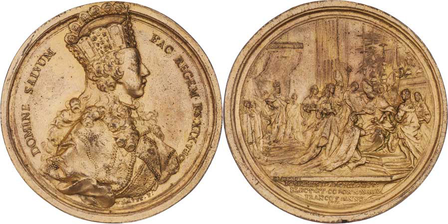 Kraft - medaile na korunovaci ve Frankfurtu 1764 - poprsí zprava, opis / scéna korunovace, 4-řádk.nápis, Sign., zlacený bronz 64 mm, hr., rysky, téměř R!
