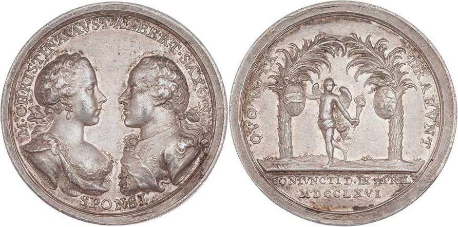Wiedemann - AR zásnubní medaile 1766 - portréty proti sobě, opis/ genius mezi palmami, opis a nápis, Sign., 42mm, 26.000g, M.1970, H.3296, nep.rysky, patina